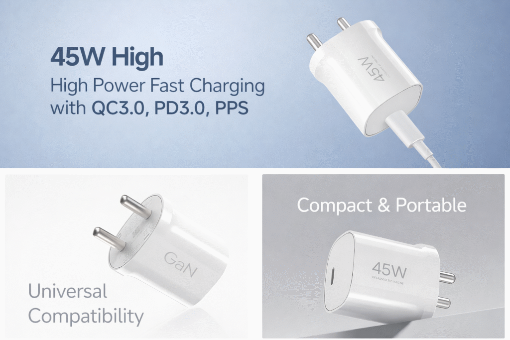 यह चार्जर 45W तक का अधिकतम आउटपुट सपोर्ट करता है, जिससे स्मार्टफोन, टैबलेट और दूसरे डिवाइसेज़ को तेज़ और सुरक्षित चार्जिंग मिलती है। फास्ट चार्जिंग के कारण समय की बचत होती है और डिवाइस जल्दी इस्तेमाल के लिए तैयार हो जाते हैं।